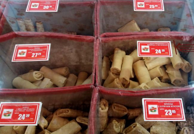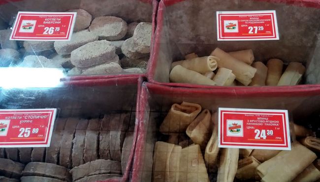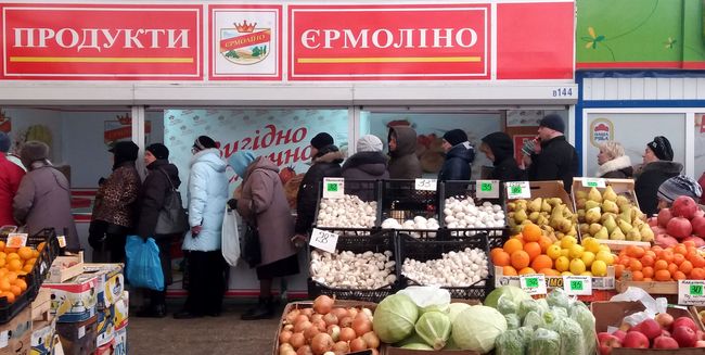 Ознакомившись с ценами на основные продукты питания, я обратила внимание на длинную очередь возле киоска с надписью: «Продукти Єрмоліно». Это, пожалуй, самая длинная очередь во всем продовольственном павильоне.