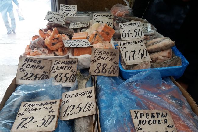 В павильоне в продаже имеются разные виды свежемороженой рыбы:
