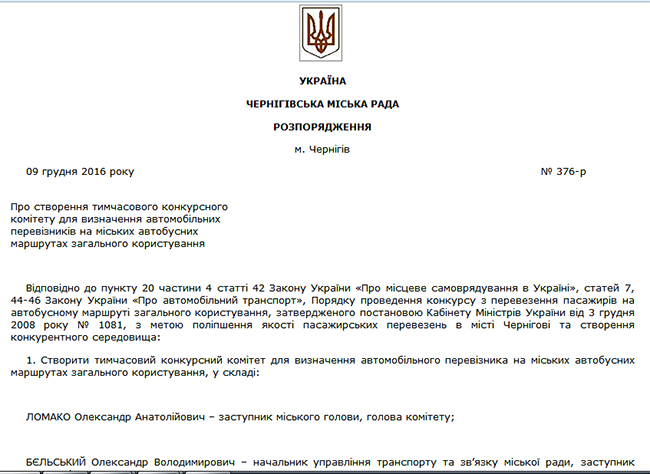 Вечером, 12 декабря в Черниговском городском совете состоялось открытие конвертов №1 по конкурсу определения автомобильных перевозчиков по городским автобусным маршрутам общего пользования. Пока о конкретных результатах говорить рано. Но то, что передел маршрутной сети состоится – это факт.