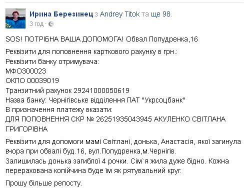 Кроме того, депутат Черниговского горсовета Ирина Березинец написала пост о том, что семья погибшей крайне нуждается в средствах и призвала всех неравнодушных помощь пострадавшим.
