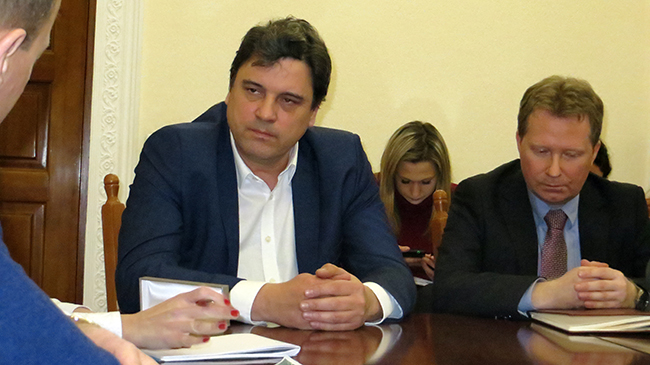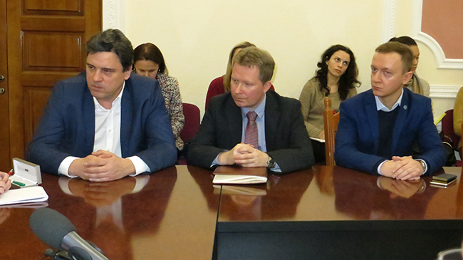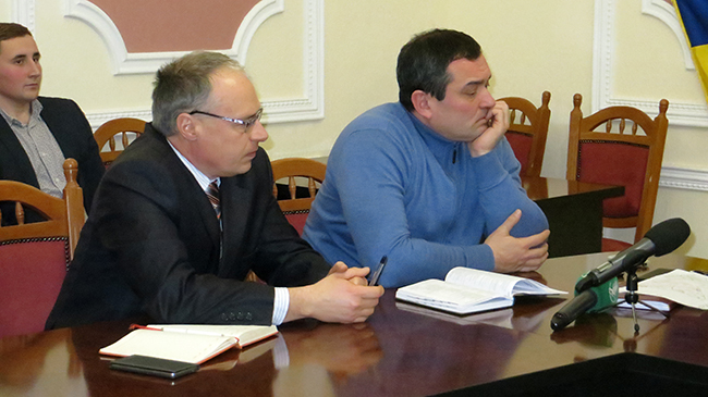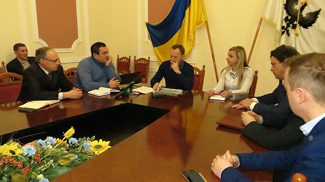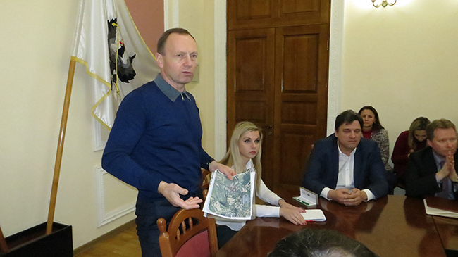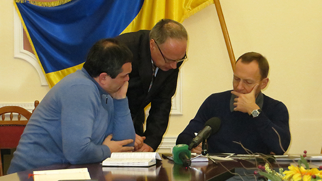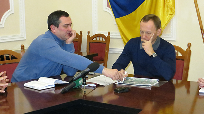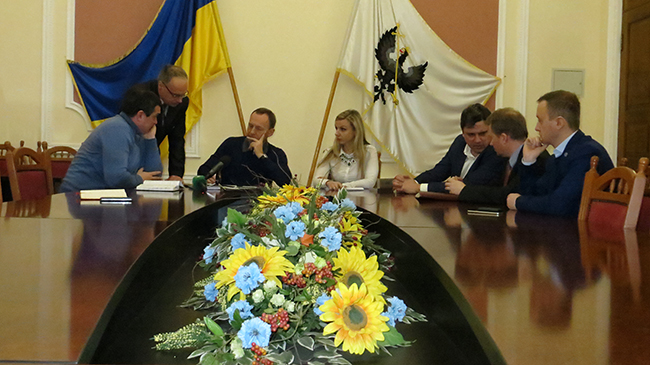 Даже после того, как журналисты других изданий заполнили малый зал горсовета, брифинг не начался. Еще в течение 10 минут городской голова Владислав Атрошенко совещался с начальником управления ЖКХ Ярославом Куцом и начальником управления земельных ресурсов Александром Пинчуком по вопросу месторасположения будущего МПЗ, а представители польской стороны терпеливо наблюдали за происходящим.