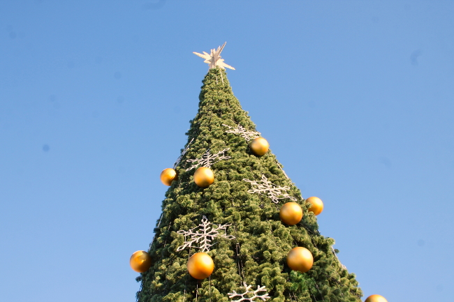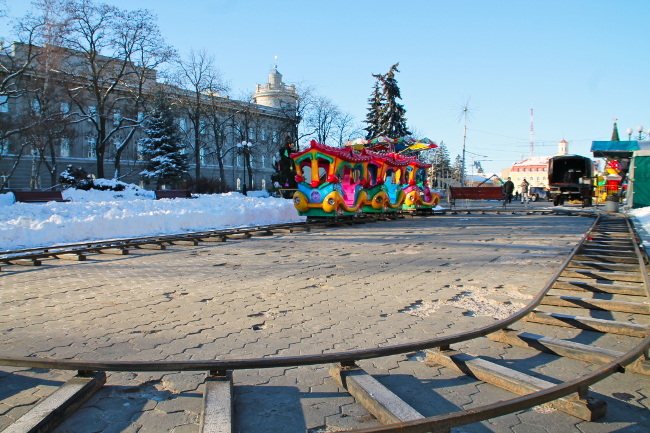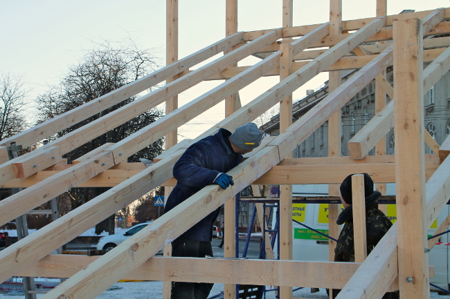 Елка в центре площади уже почти готова засиять огнями. Немного в стороне от нее, рабочие из крепких брусьев монтируют детскую горку.