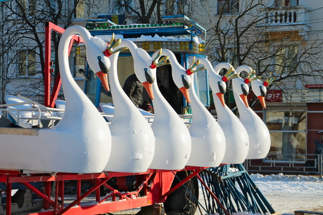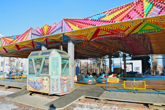 На противоположной стороне площади уже смонтирован автодром, а рядом с драмтеатром ожидает своей очереди карусель с лебедями. На самом театре, и на деревьях окружающих площадь, электрики подключают праздничную иллюминацию.