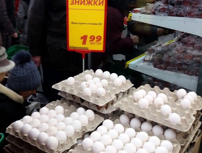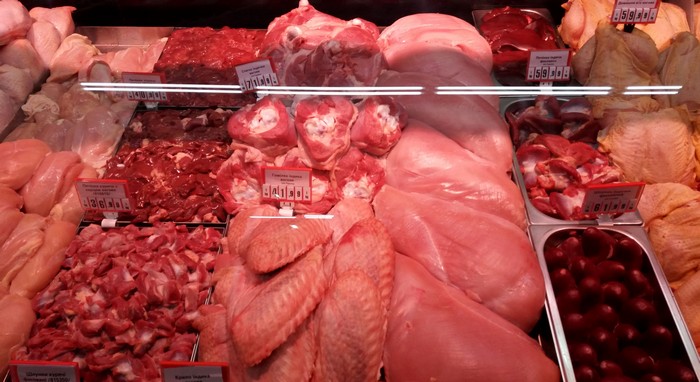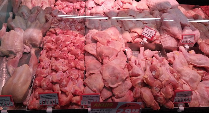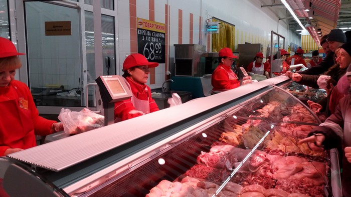 Большой выбор сегодня мясной продукции. Сразу вдоль мясного прилавка выстроилась очередь. В продаже свиное, куриное, утиное мясо с указанием скидок. Товар недели – Корейка свиная с косточкой по 68.99 грн. за 1 кг.
