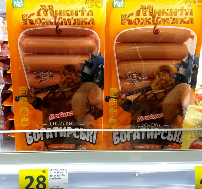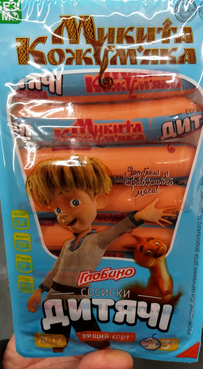 - Совсем недавно мы купили права на разработку новой линии сосисок «Микита Кожум’яко» (название героя популярного украинского мультфильма). Сегодня мы представляем новые сосиски с названием «Богатирські» по цене 28.90 грн. и «Дитячі» по цене 30.09 грн. в вакуумной упаковке, весом 350 г. Эти сосиски изготовлены из свинины с добавлением телятины, их можно есть детям от 3-х лет.