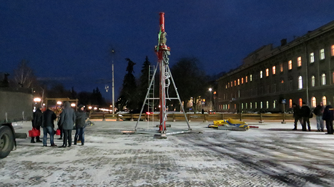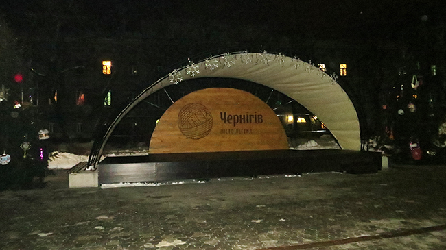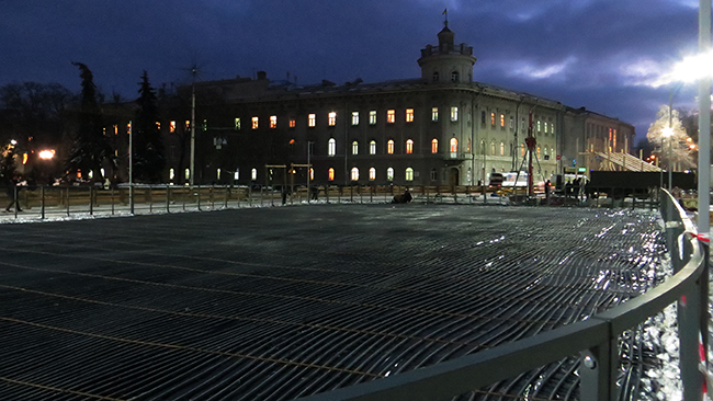 Для того, чтобы получить ответы на все вопросы, все детально разузнать, посмотреть и даже потрогать, пятничным вечером мы направились ни куда ни будь, а на Красную площадь Чернигова, где в это время должен был стартовать ключевой этап подготовки к Новому году – заливка катка с искусственным охлаждением.