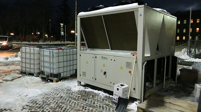 – Холодильное оборудование было произведено в Литве полностью из европейских комплектующих. Потребление электроэнергии этого холодильника – 60 кВт/ч (это максимальная нагрузка). Такая нагрузка может быть только при плюсовой температуре или заливке катка. Что касается работы катка при плюсовой температуре, то без попадания прямых солнечных лучей он может функционировать при температуре воздуха +12 –+15 град. Сколько времени будет работать каток в Чернигове решают те, кто будет управлять катком. Но, по опыту скажу, что такой каток может работать до весны. Идеальная толщина льда для такого катка – 5 см. Но, обычно, она становится больше, потому что лед постоянно нарастает. Каждый день по катку будут ездить уборочная машина, которая будет убирать снег, который люди «нарезают» и подливать воду для выравнивания катка. Вообще-то, по технологии каток нужно заливать горячей водой. И если технически найдут горячую воду, то лучше заливать ее. Цена горячей воды в Чернигове меня не пугает – я уеду домой и буду сидеть дома. А об этом спрашивайте у тех, кто будет управлять катком.