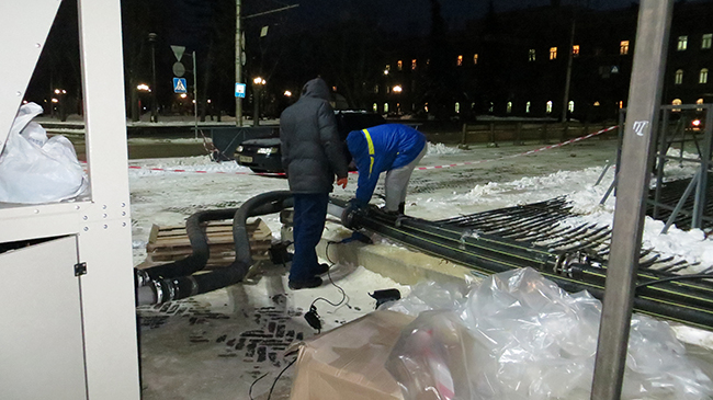 Также Дмитрий сообщил, что охлаждение катка обеспечивает охлаждающая жидкость, которая перемещается по проложенным на песчаном основании трубам. Кстати, на оборудование катка пошло более 7 км пластиковой трубы. Есть определенные нюансы и по заливке катка. Так, например, при заливке катка нужно постоянно следить за температурой воздуха, чтобы не переморозить лед. Если это случится, то лед стане хрупким и непригодным для катания. Холодильное оборудование обеспечивает температуру -12 град. Но, поскольку во время заливки катка 16 декабря на улице было -10 град, потребности в интенсивной работе холодильного оборудования не было. Кроме того, при заливке катка вода должна попадать на поверхность только в виде брызг, капель, но никак не в виде струи. Если единовременно вылить много воды, то она, хоть и замерзнет, но такой лед не будет однородным и расслоится при нагрузке. Заливка катка должна быть послойной. Как заявил Дмитрий, ночь с пятницы на субботу полностью уйдет на заливку катка – это процесс не быстрый. Продолжение заливки – в субботу. А вот пред открытием катка на нем нужно хорошенько покататься, чтобы снять нагрузку со льда.