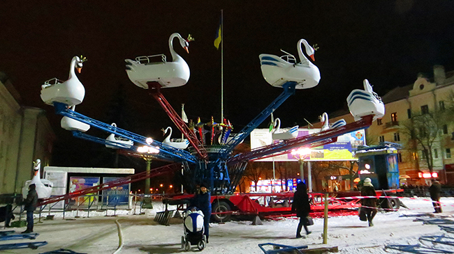 – Ответственность за организацию и проведение Нового года строго разграничена. Одни отвечают за организацию концертных программ. Другие – за установку торговых точек и организацию уличной торговли. Наше предприятие обеспечивает организацию катка и других аттракционов, – заявил Владимир Хольченков. – В этом году на Красной площади в основном будут семейные и детские аттракционы, потому что они представляют наибольший интерес для жителей Чернигова. Какого-то «экстрима» здесь не будет. Из аттракционов здесь будут: «Автодром», аттракцион «Лебеди» и, самый красивый аттракцион, так называемая «Французская свадебная карусель» – вот, ее здесь сегодня выгрузили. Нами были выбраны те аттракционы, которые будут смотрибельны, пользуются спросом и интересны для всех жителей города. Также, в этом году впервые мы пригласили предпринимателей, которые построят в Чернигове очень популярную в Украине горку с нанесенным на нее специальным покрытием. На этой горке можно будет кататься даже при плюсовой температуре. Для катания используются специальные приспособления, называемые тюбинг. Тюбинг – современная замена санкам, по сути, это надувной круг, предназначенный для спуска по льду, снегу или другому покрытию.