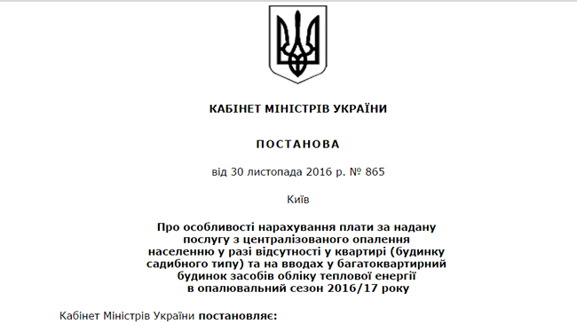 По окончании заседания Кабмина 30 ноября 2016 года было опубликовано постановление №865 «Об особенностях начисления платы за предоставленную услугу по централизованному отоплению населению в случае отсутствия в квартире и на вводах в многоквартирный дом средств учета тепловой энергии в отопительный сезон 2016/17 года.