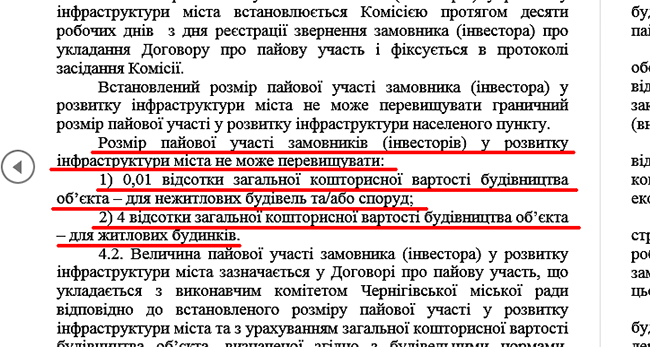 К сожалению, Черниговский городской совет использует средства Фонда совсем на другие цели, нежели предусмотрено законодательством. А в последнее время депутаты, лоббируя интересы застройщиков, вообще пытаются уменьшить суммы поступлений в бюджет города. Уже несколько раз на сессию вносили предложения по минимизации взносов застройщиков на сумму НДС (- 20%). Кроме этого, на последнюю сессию у депутатов, лоббирующих интересы застройщиков еще более грандиозные планы: выносится предложение о том, чтобы не только «отминусовать» 20% взносов, но и сократить размер паевого участия заказчиков в развитии инфраструктуры города до 0,01 процента общей сметной стоимости строительства объекта для нежилых зданий и сооружений. И это при том, что сейчас действует предусмотренная законодательством норма в 10% взносов на развитии инфраструктуры города!