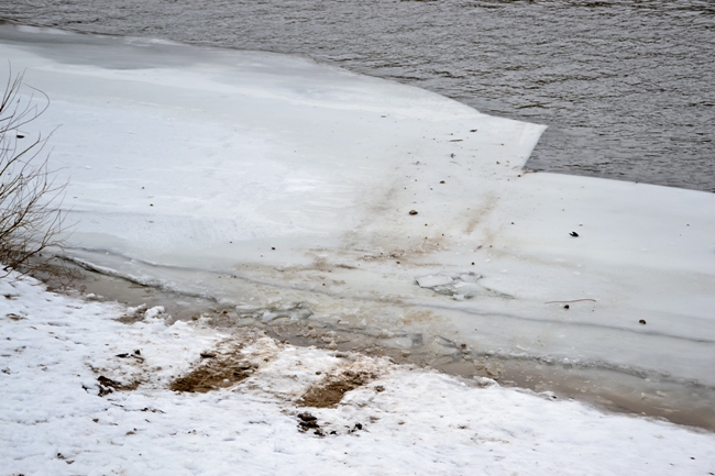 Следы, оставшиеся от автомобиля, который ушел под воду. Он выехал прямо с дороги, ведущей от Горсада и никуда не сворачивая, прямиком со склона съехал в воду. На льду остались обломки бампера.