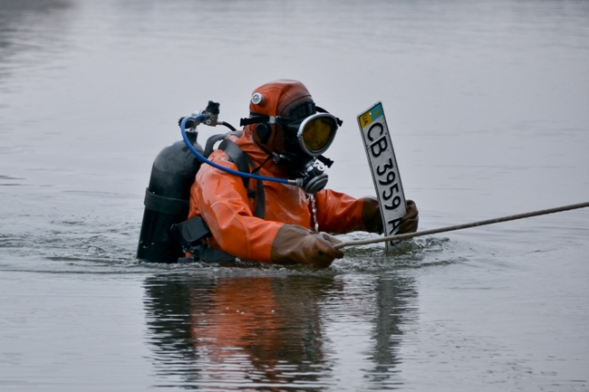 Уходя на поиски машины с лодки при помощи эхолота заметили что-то похожее на номерной знак. Спасатели готовят водолаза, чтобы его найти.