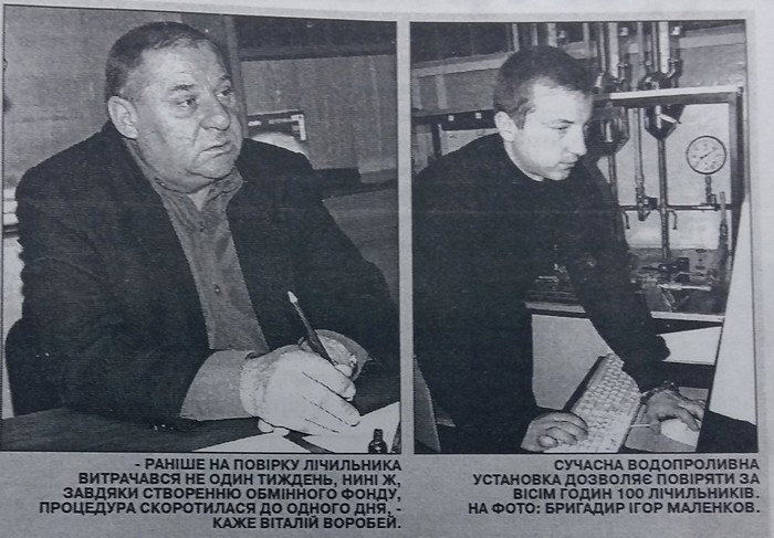 В конце ноября в прессе писали о Службе установки и обслуживания счетчиков КП «Водоканал», которая была создана еще в марте. Начальник службы Виталий Воробей рассказал, что счетчики воды граждане обязаны поверять каждые два года и раньше поверку осуществляли по адресу ул.Жабинского, 15. Так как водопроливная установка была 1973 года выпуска за 12-часовую смену на ней могли поверить лишь 30 счетчиков. Как результат – очереди и недовольство людей. В новую мастерскую по адресу ул.Белова, 2 перевели 2 бригады, что занимались счетчиками, приобрели новую водпроливную установку за 32 тысячи гривен УВЛ-15/25, которая позволяет за 8 часов поверять 100 счетчиков.