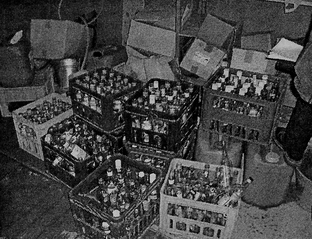 Во время осмотра в подпольном цехе были изъяты 219-литровая и 92-литровая пластмассовые бочки с разбавленным этиловым спиртом, 2 алюминиевых бидона с этиловым спиртом, 162 бутылки незаконно изготовленных алкогольных напитков с разными этикетками, бидон с жидкостью желтого цвета, оказавшейся водно-спиртовым раствором этилового спирта со стручками красного перца. Кроме того, были обнаружены и изъяты два промышленные спиртометра, 184 пустые поллитровые бутылки, 586 пробок из металлической фольги для закупоривания бутылок, свыше 7 тысяч этикеток, шланги, ведра, воронка, канистры с подготовленной для разбавления спирта водой.