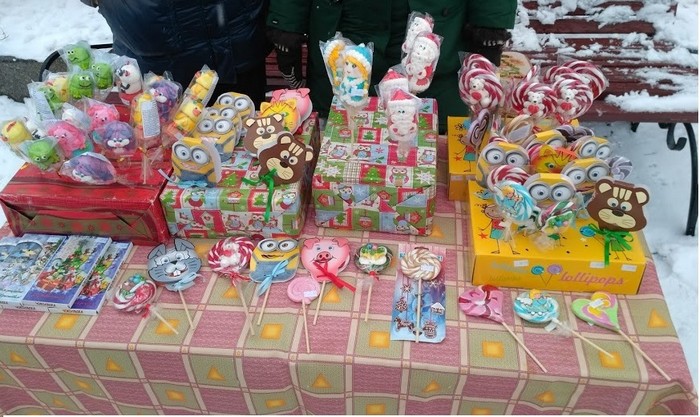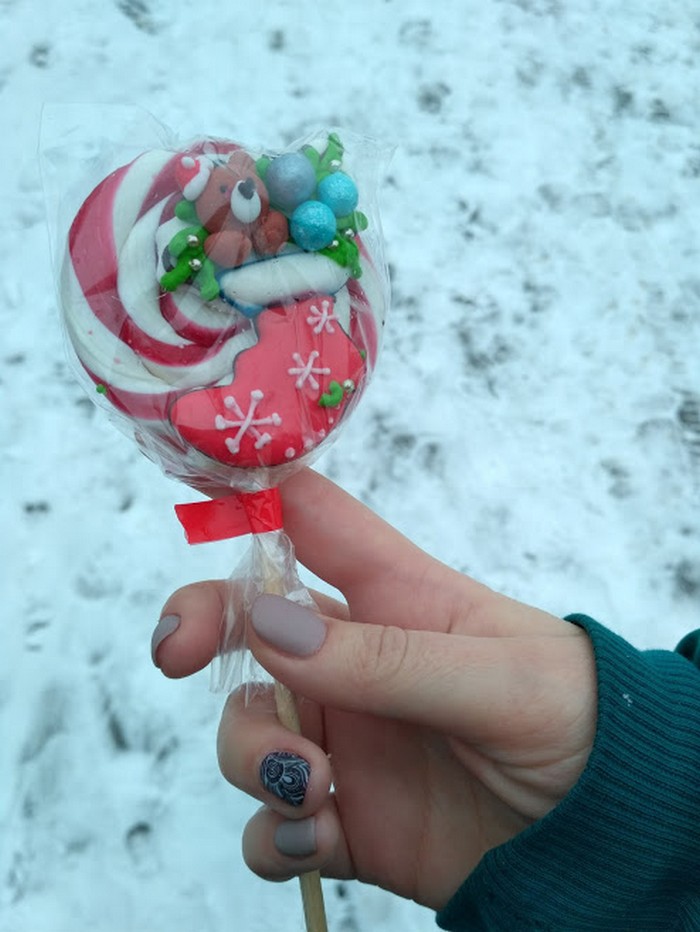 Поласувати львівськими льодяниками можна на Алеї Героїв, продавчині – привітні дівчата повідомили, що льодяники дійсно доставлені зі Львова, а також у них можна придбати смачний і святково прикрашений зефір маршмеллоу. В середньому солодощі коштують 20, 30, 35 грн. Льодяник на фото обійшовся у 30 грн.