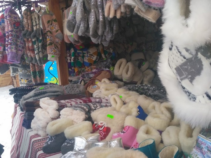 Дорослі ж можуть задовільнити свій інтерес покупками. На площі можна придбати вироби із шерсті. Рукавички і шкарпетки обійдуться у 100 грн, жилетки – від 300 грн. Поруч розташовується полив’яний посуд, ціни на нього різноманітні: від 30 грн і вище. Все це привезено із м. Яремче.