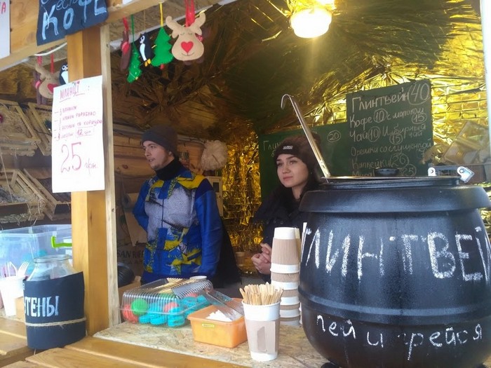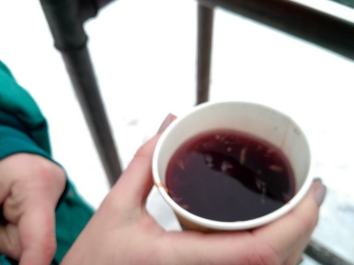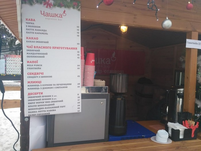Щодо цін: я обрала глінтвейн за 30 грн. (до слова, були як дешевші – за 22, 25, так і дорожчі – по 40 грн.). Мій напій привабив тим, що варився в казанку на дровах.