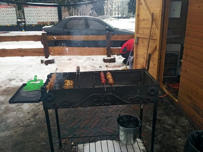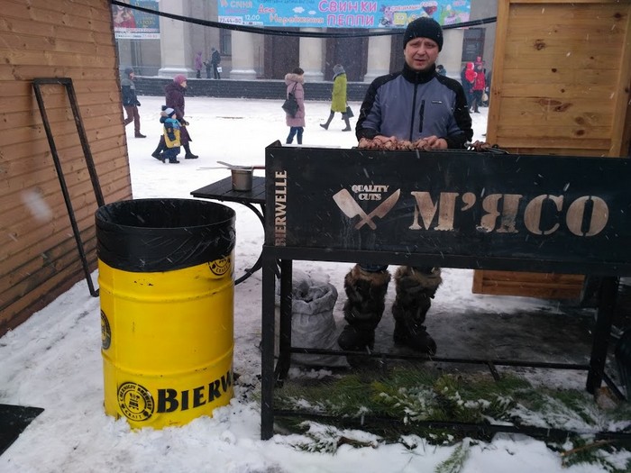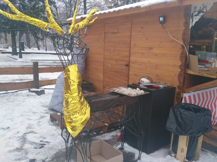 Голодним із новорічного містечка «Казкова зима» точно не піде ні дитина, ні дорослий. Широкий вибір солодощів, напоїв, закусок, на кожному кроці смажать на мангалі м'ясо. Запахи навкруги апетитні. Поласувати щойно придбаним обідом можна прямо на місці, для цього розміщені столикі та стільці.