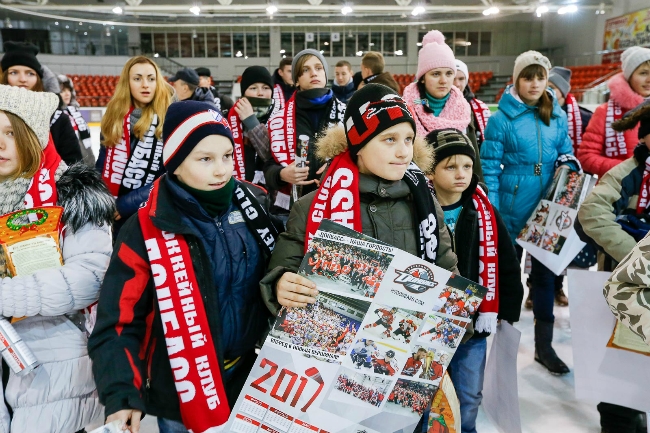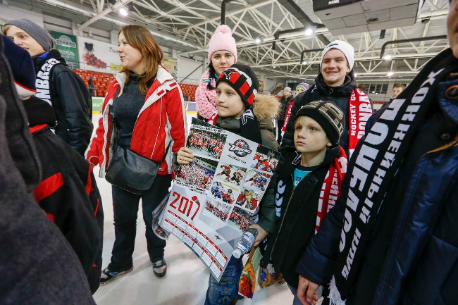 В конце матча всех юных болельщиков ждал еще один сюрприз. Команда пригласила детей на лед, где вручила им подарки к Новому году, можно было сделать фото со спортсменами и получить автограф на память.