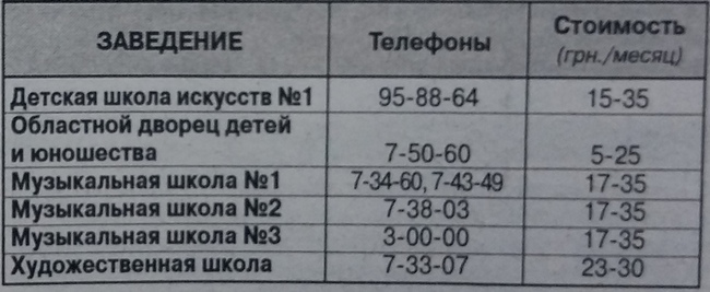 В таблице приведён далеко не полный перечень учреждений, где можно получить дополнительное внешкольное образование. Мы публикуем всего лишь самые основные из них. Однако примерно такие же цены на дополнительное образование для школьников наблюдаются и в других многочисленных студиях и школах.