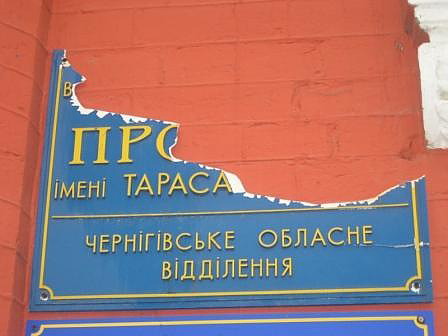 Від вивіски на стіні залишилась лише половина, та буква "А" — на асфальті. За словами Чернігівського обласного голови культурного товариства “Просвіта” Василя Чепурного, минулої зими невідомими зловмисниками двічі розбивалось вікно "Просвіти" із замахом на життя секретаря. “Ми двічі писали відповідні заяви в міліцію. - Одного разу навіть виїжджала слідчо-оперативна група, - говорить Василь Чепурний. - Проте злочини так і не були розкриті,” - продовжує він.