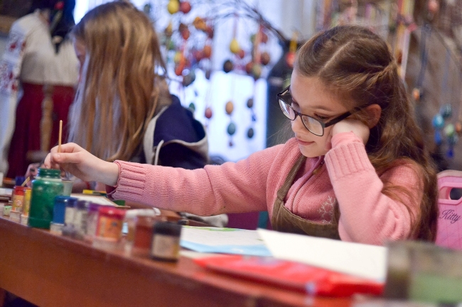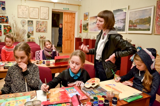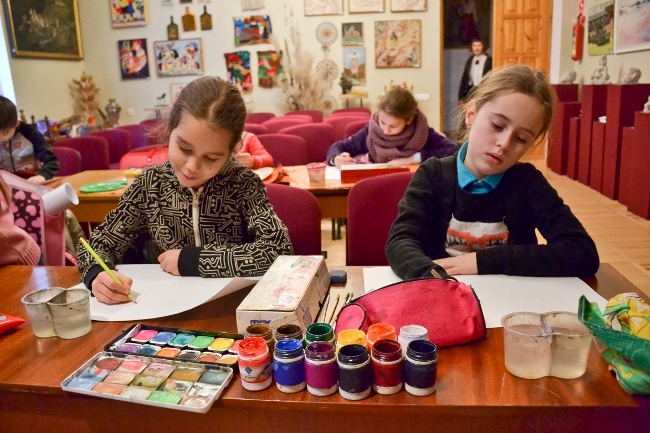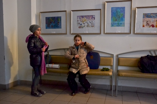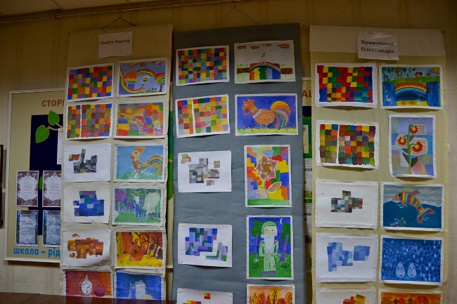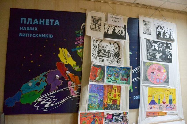 Коли діти завершили малювати свої робоити Олена Загребіна, яка працювала з дітьми, показала галерею, де виставлені намальовані дітьми роботи — від найпростіших наборів кольорів, до більш досконалих робіт. На одній із стін висить намальованіа карта, названа “Планета наших випускників”, на якій крім України є Білорусь, Канада, Аргентина, Ізраїль, Швейцарія і ще цілий ряд країн, схованих під малюнками. На іншій — малюнки з зображеннями Святого Миколая. Але знову повертаємось до наборів кольорів.