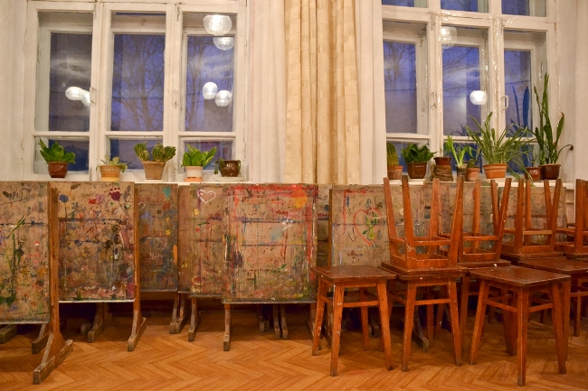 З холодної вулиці в коридор самі чи з батьками, з друзями захоять діти. Що вони йдуть малювати зрозуміло відразу — майже у кожного великі сумки для паперу. Одяг залишають за гратами в коридорі — тут облаштовані вішаки і піднімаються на другий поверх. Майже всі заняття з живопису проходять саме тут у трьох аудиторіях. Тут же і два сховища для предметів які малюють діти. Тут різноманітні прості фігури — шари, кубики, конуси, тут же посуд, тут і опудала тварин.Серед них є навіть невеликий, трохи більше метра заввишки, ведмідь.