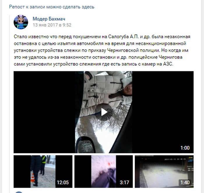 Максим Романенко сообщил, что 11-го января на его машину какие-то люди из автомобиля Митцубиси Лансер с номерами СВ 9488 пытались прицепить некое устройство. Это было поздно вечером около 22.30. Он сел в машину марки «Нива», которая принадлежит его отцу и поехал за ними. Митцубиси остановился бахмачаского райотдела, где размещен паспортный стол Бахмача, оттуда вышли четверо, одели на головы капюшоны и вошли в здание.