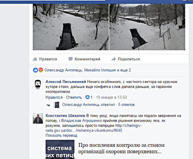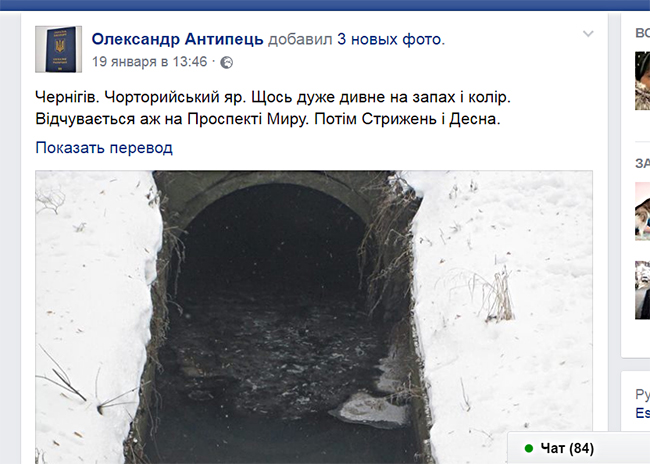 19 января в социальных сетях появилась информация о том, что в ливневую канализацию, которая проходит со стороны улицы Казачья по Чорторийскому оврагу и далее впадает в реку Стрижень, произошел несанкционированный сброс отходов. Журналисты попытались выяснить, кто и что сливал в этот день в ливневку и обратились за помощью в КП «Черниговводоканал».