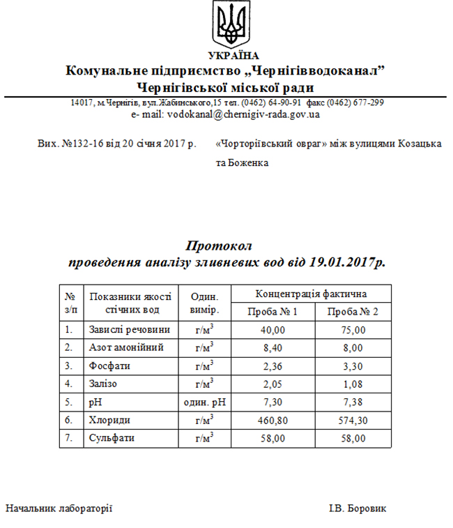 Чтобы определить, кто и что слил в ливневую канализацию, проходящую через Чорторийский овраг от улицы Казачья в направлении реки Стрижень, химико-бактериологическая лаборатория контроля сточных вод КП «Черниговводоканал» 19 января произвела отбор проб, после чего были определены предельно допустимые концентрации в воде.