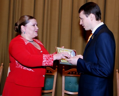 Наталья Романова вручает самому щедрому меценату 2008-го года почетный диплом