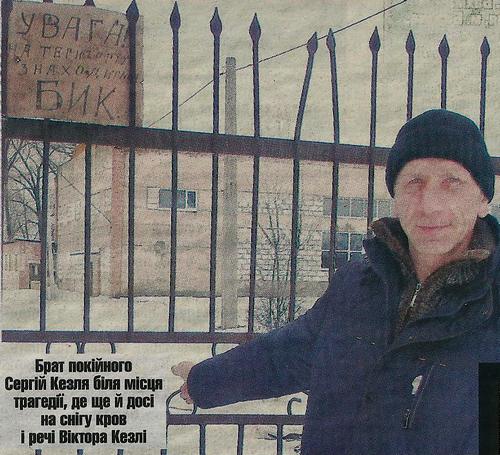На місці трагедії, за парканом комунгоспу, на снігу сліди від крові, багряні, свіжі, наче трагедія сталася лише вчора. По подвір’ю в різні боки розкидані шматки куртки, штанів загиблого, його бурки і калоші. На паркані табличка: «Увага! На території знаходиться БИК». Кров і за парканом. Саме сюди рідний брат загиблого 44-річний Сергій Кезля разом із 51-річним Віктором Хоменком, сиберізьким сільським головою, відтягни вже бездиханне тіло, рятуючи від розлюченої тварини.