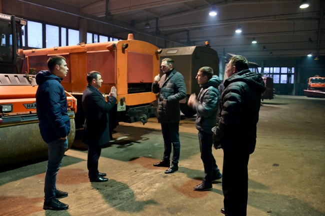 По прибытии сразу начали осмотр — оценили наличие и состояние техники, гаражей, офисного помещения. Техника на самом деле разная — есть более новые машины, но есть и очень старые, давно исчерпавшие свой ресурс. Осмотрели кабинеты, комнаты для отдыха сотрудников. Планировали поездку на асфальтный завод, но через наступившую темноту решили туда не ехать — все равно в потемках нельзя ничего увидеть.