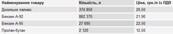На поточний рік замовили дизельне паливо по 20,50 грн./л, бензин А-92 по 21,90 грн./л, бензин А-95 по 22,50 грн./л, а також пропан-бутан по 12,50 грн./л.
