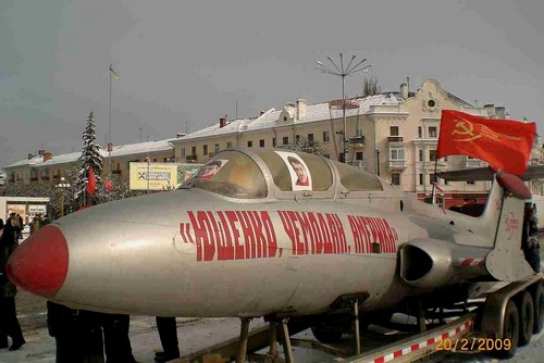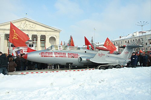 В последнее время в Чернигове модно проводить подобные акции с креативом и фантазией. Вот и в этот раз устроители не подвели – доставили на площадь самолет, на котором были наклеены портреты Ющенко. Также собирали с народа деньги на билет президенту в Америку.