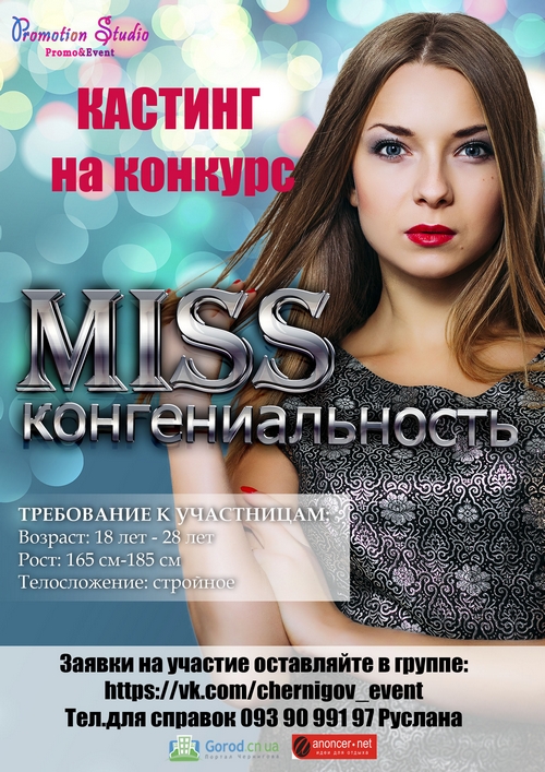 Дорогие девушки! Приглашаем всех красавиц Чернигова принять участие в первом общегородском конкурсе красоты "Miss Конгениальность"!
