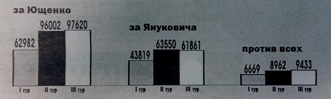 Как видно из этой диаграммы, популярность Виктора Ющенко в нашем городе возрастала от тура к туру. Количество симпатиков Виктора Януковича постоянно колебалось: меньше всего их было в первом туре, больше всего - во второй. Но самыми интересными, несомненно, стали цифры, отражающие контингент черниговчан, которые не стали отдавать свои голоса ни тому, ни другому претенденту. С каждой новой попыткой их количество неуколонно росло и к последнему туру увеличилось более чем на три тысячи человек! Это свидетельствует о том, что нашим соотечественникам уже порядком надоел перманентный избирательный процесс. «Что занадто, то не здраво», - говорят в таких случают поляки. "Хорошего – понемножку!» - добавляем мы.
