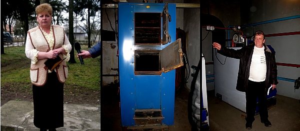 Директор Карпилівської школи Алла Бондар; Котел у школі села Карпилівка, яка опалюється дровами; Будинок культури в Острі теж має твердопаливний котел