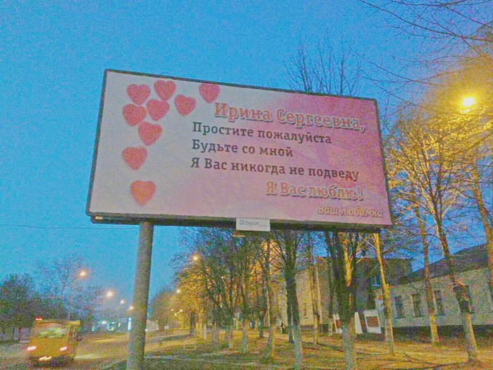 В марте на улице 1 Мая, 173 на билборде фирмы Octagon появилось любовное послание некой Ирине Сергеевне. Надпись исполнена на розовом фоне с сердечками. Сообщение гласит: