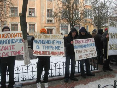 Виявляється, вже втретє за останні два місяці прокуратуру пікетують відставні міліціонери. Вони вимагають звільнення з під варти шістьох працівників органів внутрішніх справ, які проходять по справі вбивства прилуцького підприємця Сергія Кунцевського. З відставниками під стінами обласної прокуратури стоять також родичі затриманих міліціонерів.