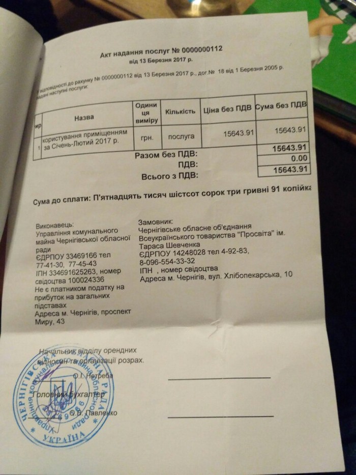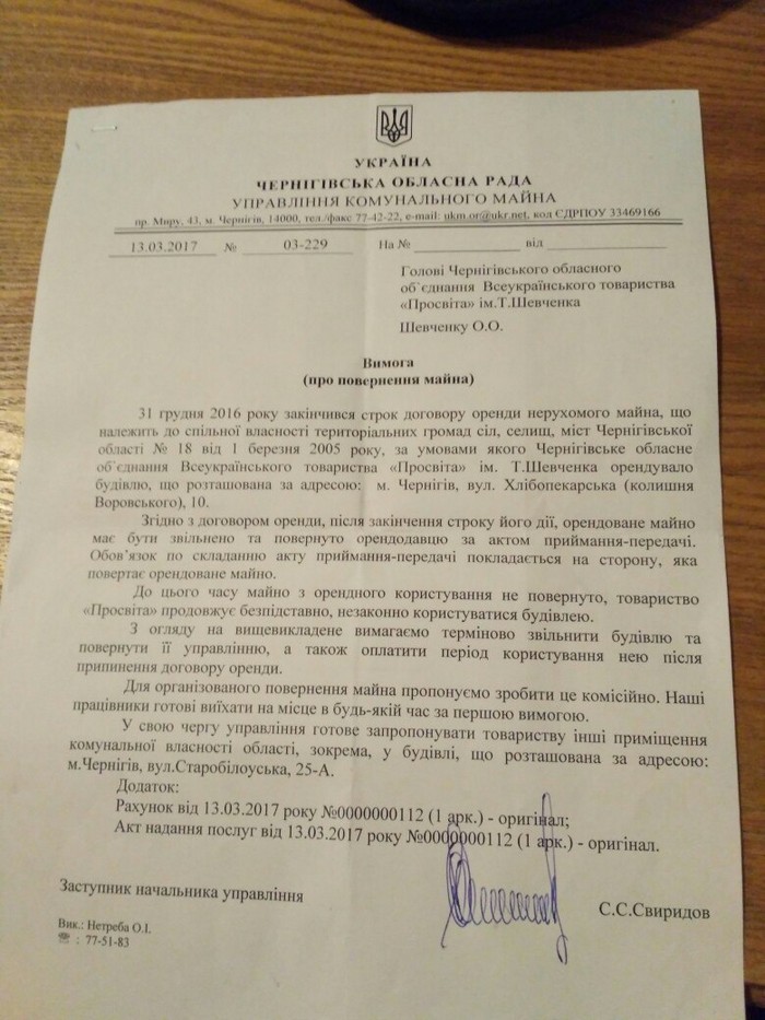 Зокрема, у листі говорилось наступне: 31 грудня 2016 року закінчився строк договору оренди нерухомого майна, що належить до спільної власності територіальних громад сіл, селищ, міст Чернігівської області…Згідно з договором оренди, після закінчення строку його дії, орендоване майно має бути звільнено та повернуто орендодавцю… До цього часу майно з орендного користування не повернуто, товариство «Просвіта» продовжує безпідставно, незаконно користуватися будівлею…вимагаємо терміново звільнити будівлю та повернути її управлінню, а також оплатити період користування нею після припинення договору оренди (а це на хвилиночку – 15 643.91 грн, алло, люди, – це ж громадська організація!).