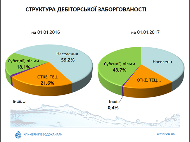 Кроме дебиторской задолженности по льготам и субсидиям, значительные суммы долга имеют теплоснабжающие предприятия и население, особенно большая задолженность у ПАО «Облтеплокоммунэнерго». Одной из задач на 2017 год для Водоканала является перевод расчетов с ОТКЭ по показаниям приборов учета. Отпуская воду для теплогенерирующей организации по нормативу, Водоканал теряет до 25% объемов общей реализации воды, поставляемой на подогрев.