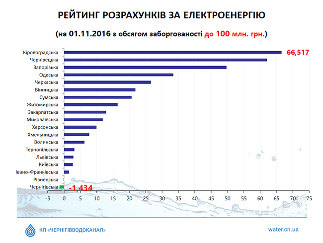 По официальной информации НКРЕКУ, обнародованной 12 декабря 2016 года на сайте регулятора, «Черниговводоканал» является единственным предприятием, которое имеет переплату за потребленную электрическую энергию (при том, что долги большинства лицензиатов при этом достигают десятков и даже сотен миллионов гривен).