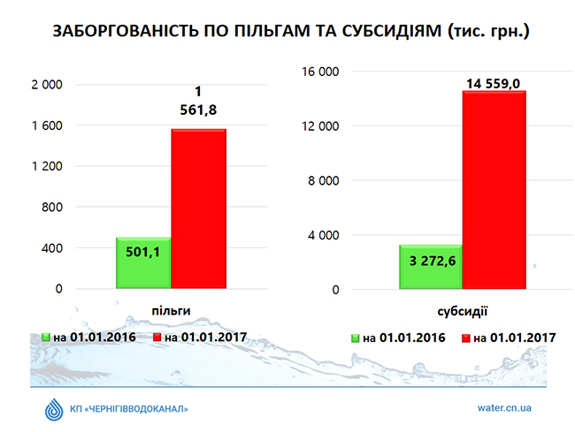 Парадоксальным есть то, что суммы начислений по льготам и субсидиям не приходят «живыми» деньгами, а их можно использовать только для погашения задолженности по э/энергии. Но, так как Водоканал сократил потребление э/э за счет модернизации оборудования, забрать деньги у Государства не представляется возможным. По сравнению с 2015 годом задолженность Государства по субсидиям выросла в 4,5 раза, а по льготам – более чем в 3 раза. На начало 2017 общая сумма задолженности по льготам и субсидиям перед КП «Черниговводоканал» составила почти 18 млн. грн.