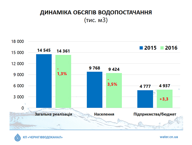 Тем не менее, благодаря внедрению комплекса мероприятий по улучшению деятельности службы по работе с клиентами, более глубокому анализу и усилению контроля, в 2016 году удалось существенно замедлить темпы падения объемов реализации по отношению к предыдущему году. Так в 2015 году реализация снизилась на 13,3%, а в 2016 году всего лишь на 1,3%. При этом объемы водопотребления населением уменьшились на 3,5%, а по предприятиям и бюджету – увеличились на 3,3%.