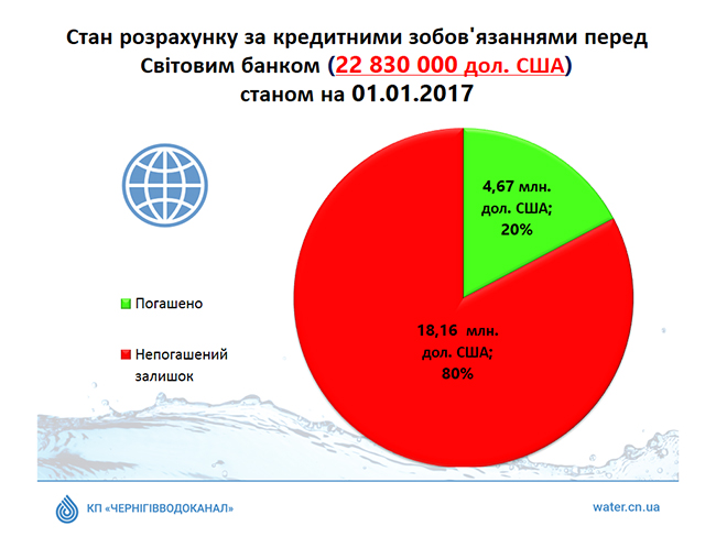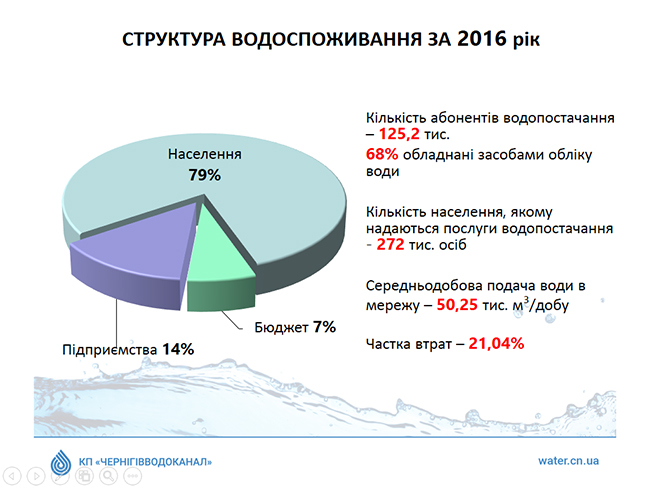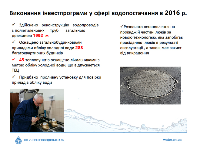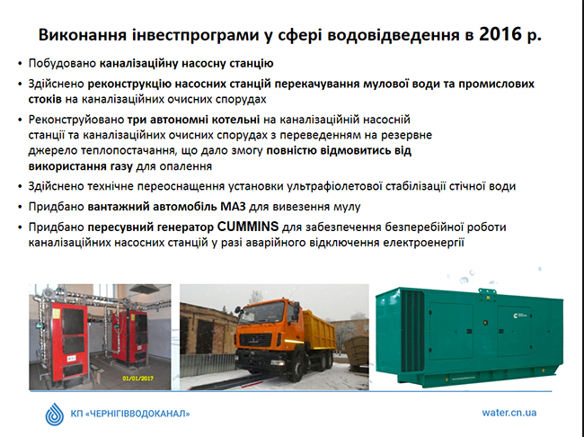 На сегодняшний день КП «Черниговводоканал» является единственным коммунальным предприятием Черниговского городского совета, которое несколько лет назад завершило внедрение Проекта развития городской инфраструктуры, который финансировался за счет средств займа МБРР.