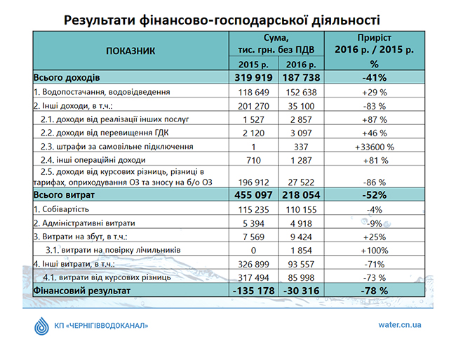 По информации, предоставленной управлением экономики Черниговского городского совета, в 2016 году в КП «Черниговводоканал» произошло улучшение основных показателей финансово-хозяйственной деятельности. Доходы предприятия от основного вида деятельности увеличились на 29%. Существенно выросли и другие операционные доходы от реализации дополнительных услуг – на 87%, от превышения ПДК – на 46%. Возросло количество штрафов за самовольное подключение к сетям. В то же время в структуре отчетов предприятия наблюдается уменьшение не операционных доходов вследствие того, что в отчетном году, в отличие от 2015 года, КП «Черниговводоканал» не получало разницы в тарифах, а также меньшими были доходы от валютной курсовой разницы.