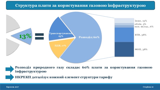 Жаль, что уровень и условия жизни в Украине, по-прежнему, какие-то антиевропейские, но попробуем разобраться в вопросе. Сколько и как придется платить за газ? Для пущего понимания рядовым пользователем НКРЭКУ оформили презентацию, где указано, что доля транспортировки в цене на газ для потребителя составляет 13%. Грубо говоря, эти самые 13% отделят от привычной суммы за голубое топливо.