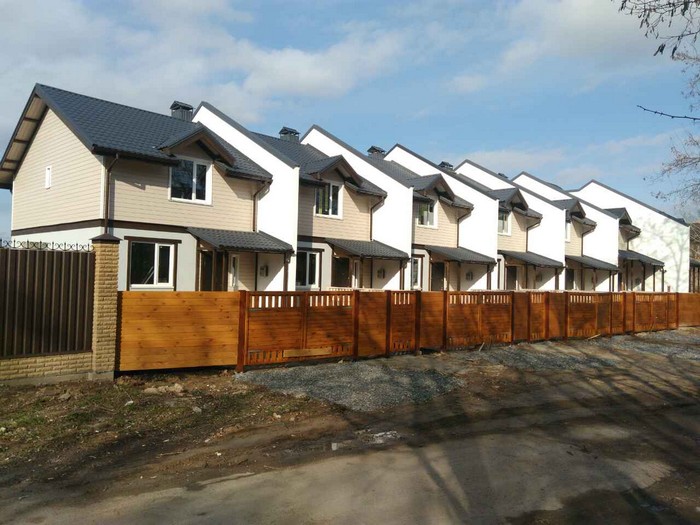 Что касается варианта подешевле, то это 7 таунхаусов в начале поселка, окна которых выходят на радиозаводскую больницу. Данный участок был куплен одним из первых, именно под застройку домиками эконом-варианта. На первый взгляд, главный минус домиков – то что снаружи они отделаны сайдингом, а не кирпичом, что дешевит внешний вид, особенно на фоне зажиточных соседей.